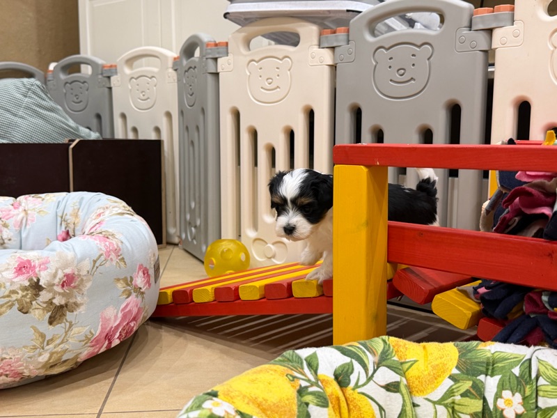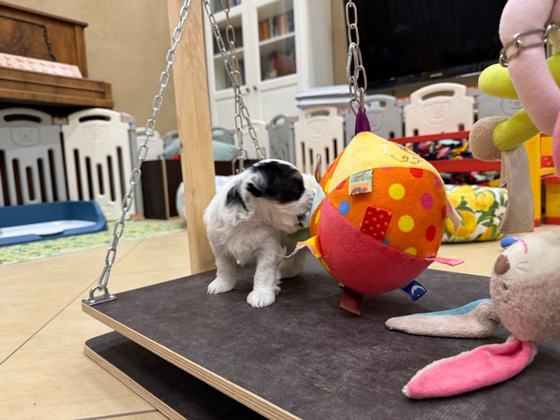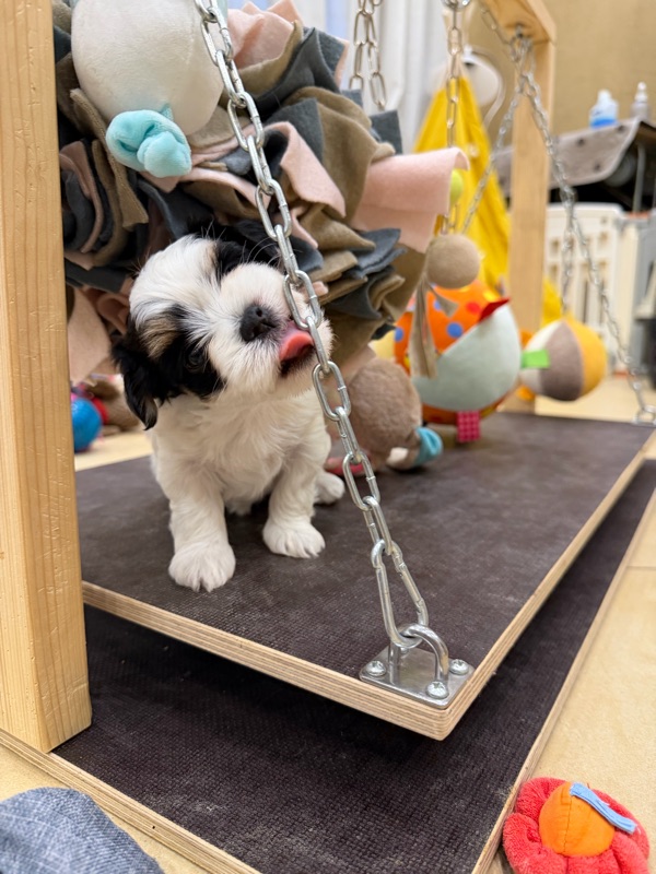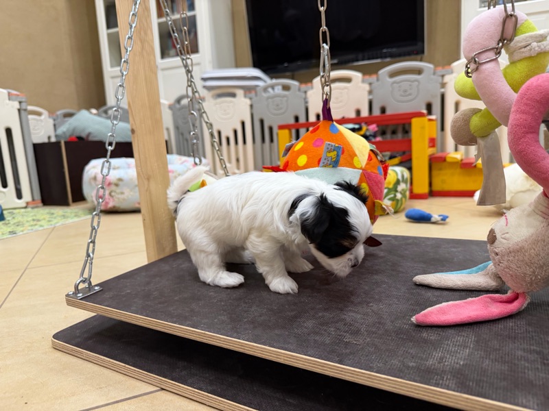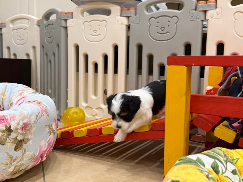 Die kleine Hündin sucht Herausforderungen auf dem Wackelbrett