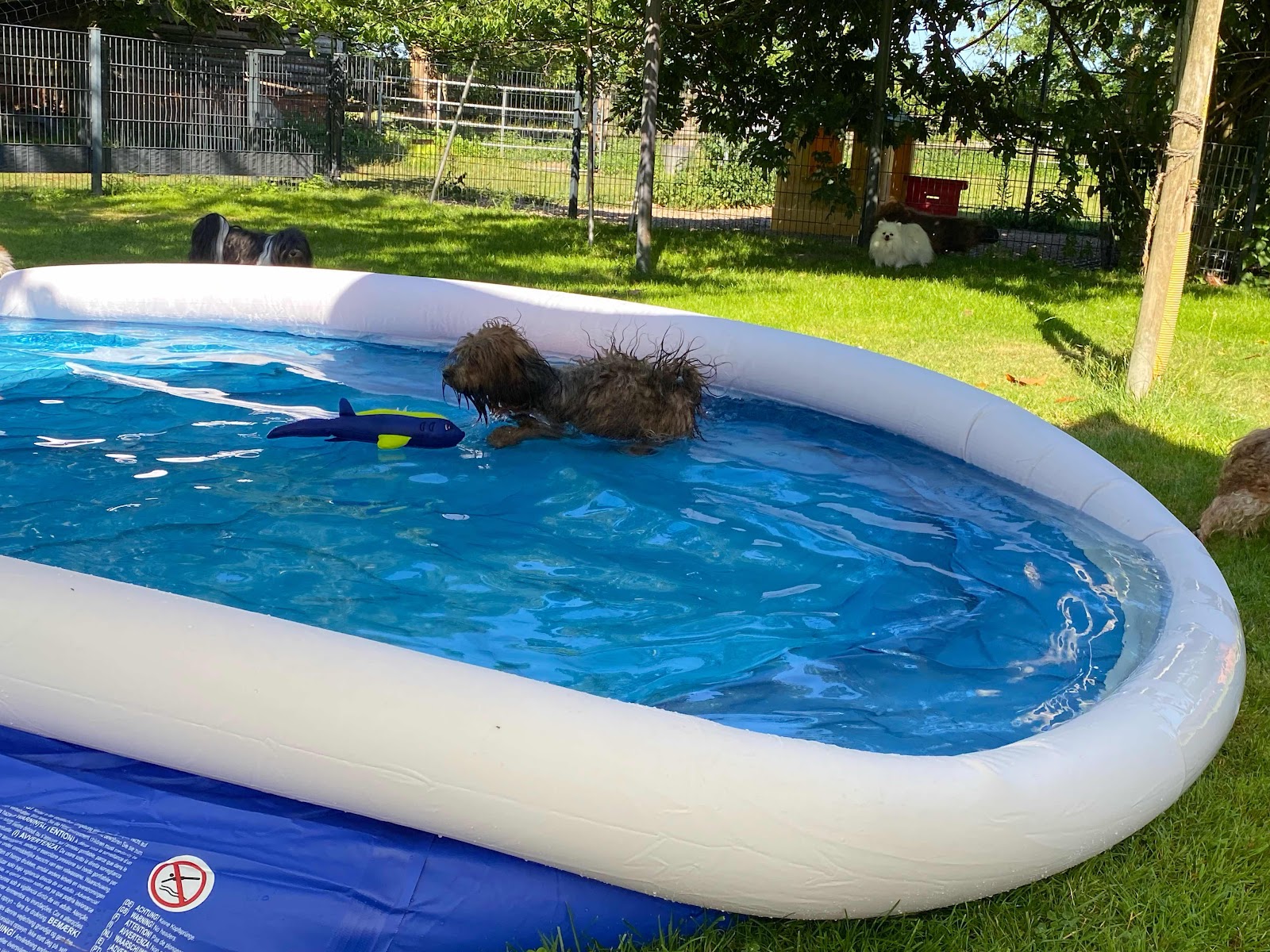 Für die heißen Tage haben wir den Hunden einen größeren Pool gekauft. Sie hatten viel Spaß beim Plantschen 💦