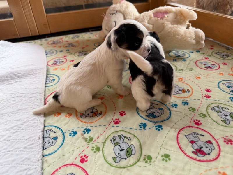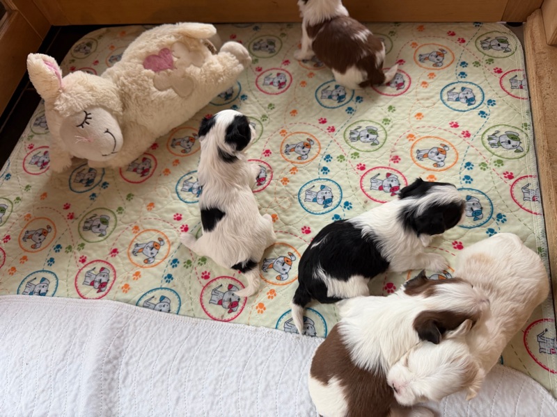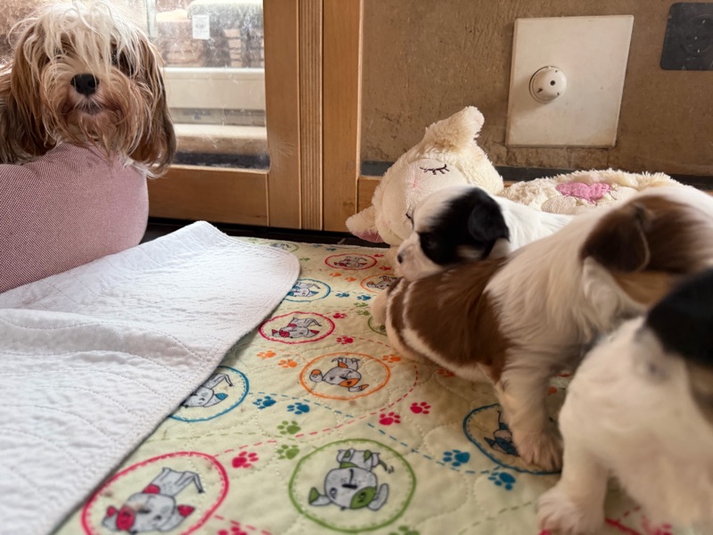 Immer wenn die Welpen die Augen geöffnet haben und ihre Beinchen benutzen, steht der Umzug in unsere Wohnküche an. Hier findet das Leben statt und sie bekommen viel mehr mit als in unserem Wohnzimmer. Gestern war es dann soweit und wir schmücken den Baum ab um bereiten den Spuelplatz im Wohnzimmer vor.